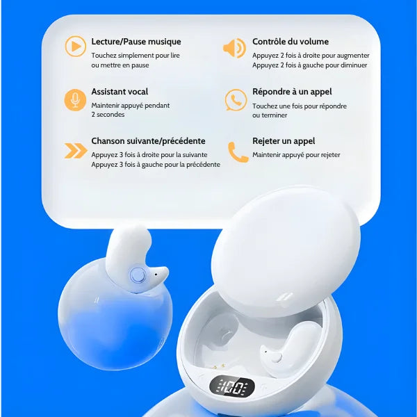 Leur design ergonomique épouse la forme naturelle de votre oreille — aussi légers qu’une plume, ils se font oublier dès les premières minutes. Profitez de vos podcasts, détendez-vous ou endormez-vous confortablement, sans la moindre pression ni douleur.